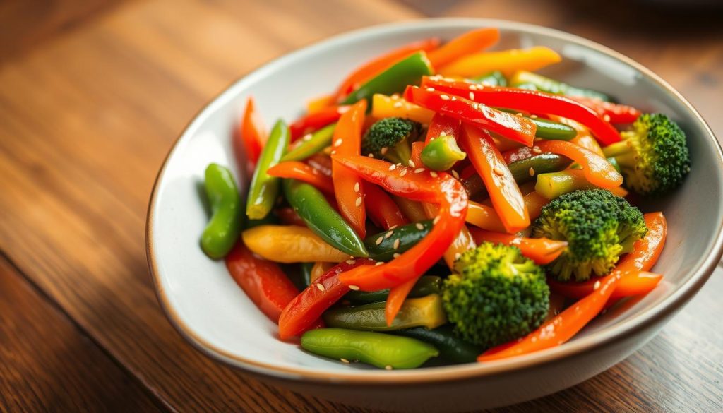 Combining these vibrant vegetables in your stir-fry not only boosts the dish’s visual appeal. It also ensures a well-rounded intake of essential vitamins and minerals.