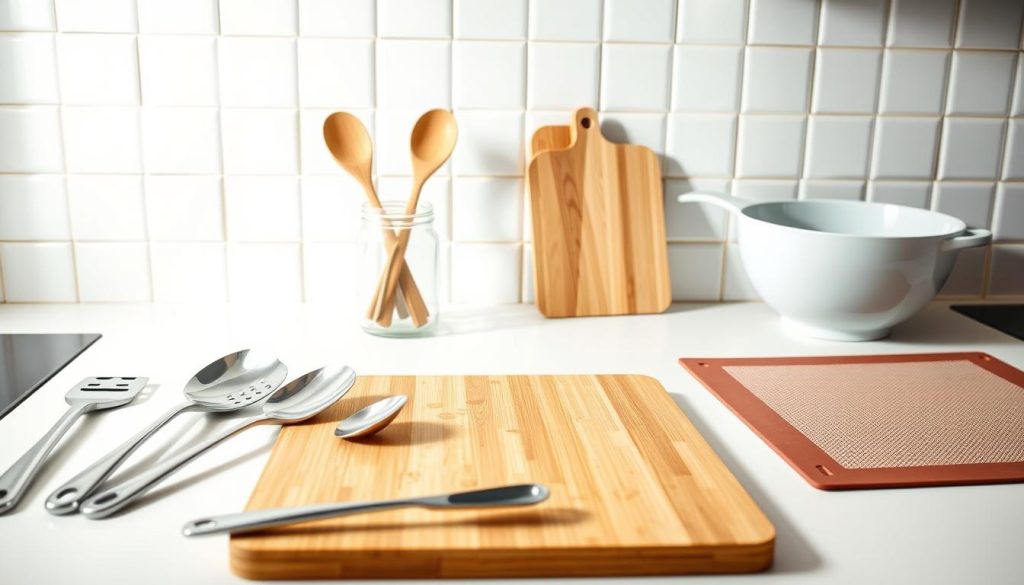 Looking into eco-friendly kitchen tools, you’ll find many options. They’re made from materials like bamboo, silicone, and stainless steel. These alternatives work just as well as old utensils but are safer for your food.